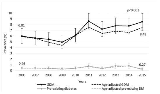 The prevalence of GDM increased among twin pregnancies during the study period (from 6.01% to 8.48%, p < 0.001). The prevalence of pre-existing diabetes in twin pregnancies remained stable (p = 0.416) (Figure 2).
