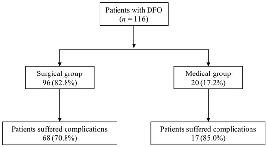 Some previous investigations [34,35] that retrospectively compared surgical and medical treatment for the management of DFO found similar outcomes between both therapies. Game et al. [34] found similar remission rates between the surgical (78.6%) and medical group (82.3%); Lesens et al. [35] also found favourable outcomes: 80% in the surgical group versus 87% in the medical group.