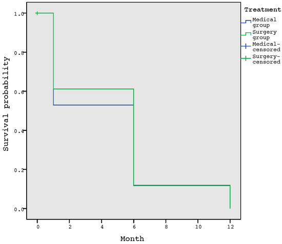 The probability of suffering a complication event in the first month after healing was 59.5%, and the median complication-free survival was 6 months. When comparing the survival of the complication-free time between the surgical and medical treatment of osteomyelitis, we did not observe significant differences (p = 0.665) (Figure 2).