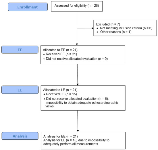 Scores, respiratory/ventilatory and hemodynamic data obtained at EE and LE echocardiographic examination.
