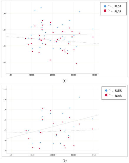 Linear regression analysis including all echocardiographic measurements did not detect a correlation between RV size and PaO2/FiO2 ratio (RLDR: r2 = 0.000, p = 0.907; RLAR: r2 = 0.02, p = 0.466) (Figure 2a). Separate evaluation of time-dependent RV performance also found no correlation between RV size and PaO2/FiO2 ratio at EE (RLDR: r2 = 0.149, p = 0.084; RLAR: r2 = 0.002, p = 0.835) (Figure 2b). Nevertheless, a trend towards a slight, though significant increase in RV size associated with a decreased PaO2/FiO2 ratio became noticeable in the second week of ICU treatment at LE (RLDR: r2 = 0.27, p = 0.047; RLAR: r2 = 0.168, p = 0.129) (Figure 2c).