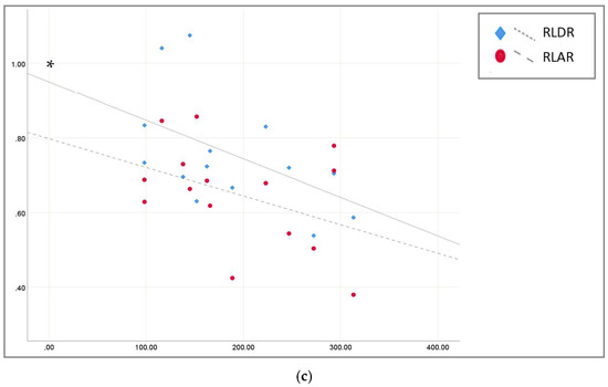 (a): Linear regression of RV/LV ratio (RLAR = red; RLDR = blue) and pO2/FiO2 ratio; All measurements (RLDR: r2 = 0.000, RLAR: r2 = 0.02); (b): Linear regression of RV/LV ratio (RLAR = red; RLDR = blue) and pO2/FiO2 ratio EE (RLDR: r2 = 0.149, RLAR: r2 = 0.002); (c): Linear regression of RV/LV ratio (RLAR = red; RLDR = blue) and pO2/FiO2 ratio LE (RLDR r2 = 0.27 *, RLAR r2 = 0.168); * = p < 0.05.