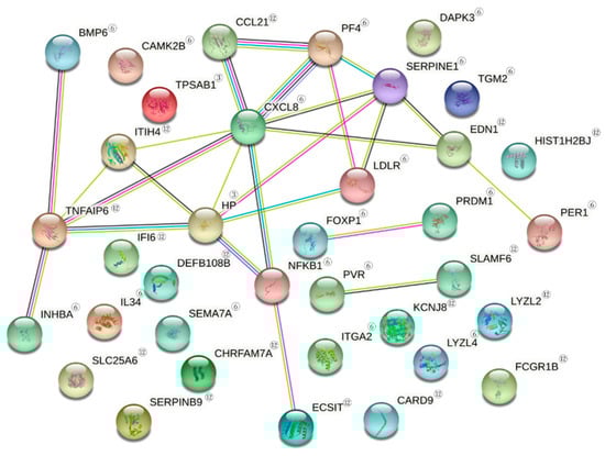 In the BP ‘defense response’, the protein encoded by CXCL8, which is a downregulated DEG, is called interleukin-8 (IL-8). IL-8 is secreted by mononuclear macrophages, neutrophils, eosinophils, T lymphocytes, epithelial cells, and fibroblasts. IL-8 is also known as a neutrophil chemotactic factor with two major functions. It induces chemotaxis of target cells to the infected site. IL-8 is also known as a strong promoter of angiogenesis. IL-8 expression is regulated by the transcription factor NF-κB [36,37,38,39,40,41,42].