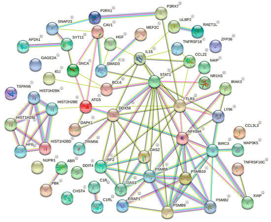 As the results of PPI analysis of DEGs involved in the defense response with STRING, CXCL8 was a gene associated with multiple genes in the upregulated DEGs of the defense response. The relationships with SERPINE1, PF4, NFKB1, TNFAIP6, EDN1, CCL21, ITIH4 and HP were confirmed. In addition, HP, ITIH4, TNFAIP6 and NFKB1 were also associated with multiple genes (Figure 1). In the downregulated DEGs, STAT1 was a gene associated with multiple genes. In particular, it was associated with SMAD3, IL15, CCL22, NAIP, NRIH3, LY96, NFKBIA, PSMB8, PSMB9, PSMB10, OSA2, OAS3, IRF2, BCL6 and DDX58. In addition, NFKBIA, TLR3, IL15 and IRF2 were genes associated with multiple genes (Figure 2).
