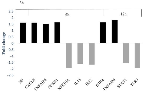 At 12 h, BPs on upregulated DEGs are, for example, GO: 0006955 ~ immune response, GO: 0006952 ~ defense response, GO: 0009605 ~ response to external stimulus, GO: 0048584 ~ positive regulation of response to stimulus (Table 7), BPs on downregulated DEGs are, for example, GO: 0010468 BP such as ~ regulation of gene expression, GO: 0007155 ~ cell adhesion, GO: 0022610 ~ biological adhesion (Table 8).