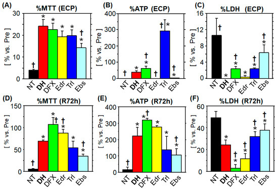 At the ECP, the NT group showed a significant decrease in MTT metabolism (4.0% ± 0.3% vs. normal), whereas all the treatment groups showed significantly increased MTT metabolism, compared to the NT group. Among the treatment groups, the Ebs group showed the lowest MTT metabolism, and the others showed an equivalent effect on MTT catabolism. Notably, the mean value for MTT metabolism was the highest in the DH group (24.2% ± 3.1% vs. normal; Figure 1A). At R72h, the NT group showed the lowest value (5.0% ± 1.2% vs. normal), and all treatment groups showed significantly higher MTT metabolism compared to the NT group. The MTT metabolism in the DH group (68.7% ± 3.0% vs. normal) was the third highest among the five tested agents. The DFX and Edr groups showed higher MTT metabolism, and the Trl and Ebs groups showed lower values than those of the DH group (Figure 1D).