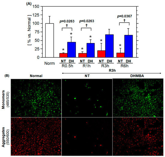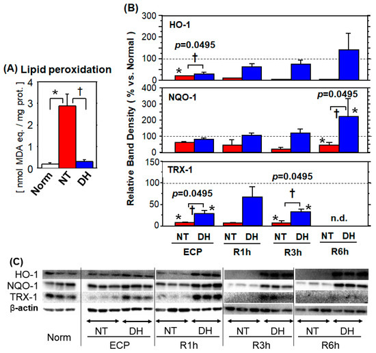 At R1h, the lipid peroxidation product was 15.9 times higher in the NT group compared to that in normal cells. This increase was significantly reduced to 1.7 times (vs. normal) in the DH group (* p < 0.05, vs. normal; † p < 0.05, NT vs. DH groups; Figure 4A).