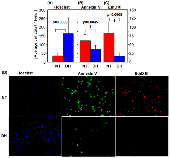 The number of the Hoechst33324-positive cells was 35.9 ± 16.3 cells/field in the NT group, and it increased significantly in the DH group to 162 ± 92 cells/field (Figure 3A). The number of Annexin V-positive cells was 60.3 ± 18.1 cells/field in the NT group, compared to 35.3 ± 12.2 cells/field in the DH group (Figure 3B). The number of the EthD-III-positive cells was 82.4 ± 30.9 cells/field in the NT group; this number decreased significantly in the DH group to 16.5 ± 9.6 cells/field (Figure 3A). DHMBA treatment resulted in a 42% and 80% reduction in apoptotic and necrotic cells, respectively († p ≤ 0.0045, NT vs. DH groups; Figure 3A–C).
