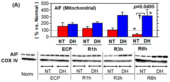 The mitochondrial AIF level at the ECP tended to decrease after rewarming, with time, and reached 32.6% ± 19.7% (vs. normal) at R6h. Conversely, in the DH group, mitochondrial AIF tended to increase with time, and reached to 312 ± 96.8% (vs. normal) at R6h. (* p < 0.05, vs. normal; † p = 0.0495, NT vs. DH groups; Figure 5A).