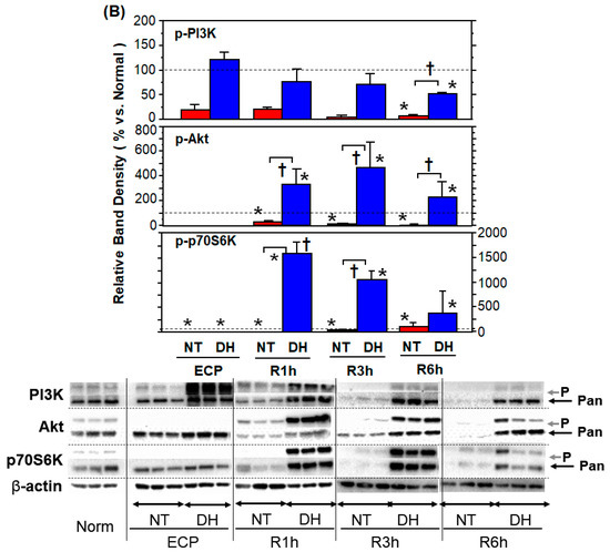 The phosphorylated Akt (Ser473) (p-Akt) level in the NT group peaked at R1h (28.8% ± 9.4% vs. normal) and being undetectable (<8.6% vs. normal) at R3h and R6h. Conversely, p-Akt level in the DH group was undetectable at the ECP; however, phosphorylation exceeded the normal level at R1h (335% ± 122% vs. normal), R3h (469% ± 203% vs. normal), and R6h (229% ± 122% vs. normal), showing a significant augmentation, compared to the NT group. (* p < 0.05, vs. normal; † p = 0.0495, NT vs. DH groups; Figure 5B).