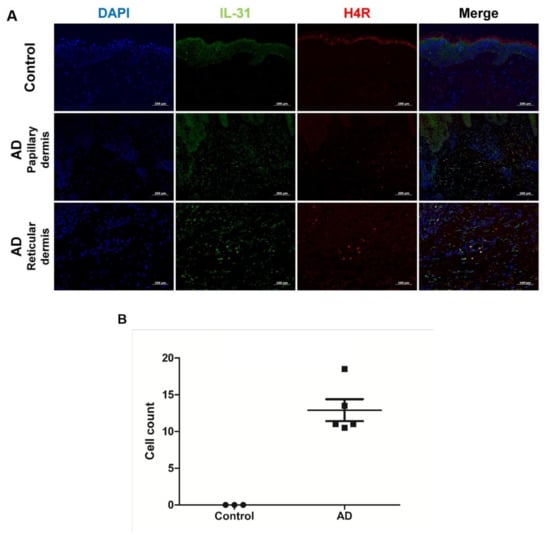 Immunofluorescence was performed on 5-μm sections of 4% paraformaldehyde-fixed, paraffin wax-embedded tissue. Following dewaxing and rehydration, antigen retrieval was performed using citrate buffer. Sections were blocked with 10% bovine serum albumin (BSA) in phosphate-buffered saline with tween 20 °C (PBST) at room temperature for 1 h. Sections were incubated with polyclonal IgG goat antibody specific to human IL-31 (PA5-47405; Thermo Fisher, Rockford, IL, USA) and polyclonal rabbit antibody specific to human H4R (SP4670P; OriGene Technologies, Rockville, MD, USA) overnight at 4 °C. After rinsing with phosphate-buffered saline (PBS), sections were secondarily stained with Alexa Fluor® 594 chicken anti-rabbit IgG (A-21442; Thermo Fisher) and Alexa Fluor® 488 donkey anti-goat IgG (A-110555; Thermo Fisher) for 2 h in the dark at 37 °C. After washes with PBS, cover slips were mounted with Vectashield Antifade Mounting Medium (Vector Laboratories, Burlingame, CA, USA) containing 4′,6-diamidino-2-phenylindole (DAPI), to counterstain cellular nuclei. Immunofluorescence images were acquired using a fluorescence microscope (Axiovert 200, Zeiss, Germany). We counted the number of localized cells in a high-power field (×200) at a random two sites of biopsy section per patient.