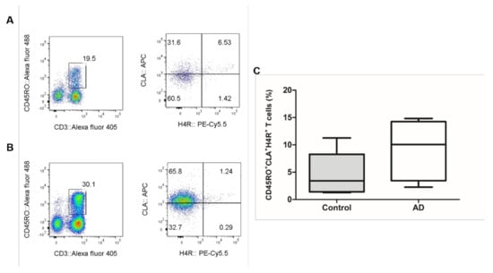 3.3. Comparison of CD45RO+CLA+H4R+ T Cells in Patients with AD and Healthy Controls
