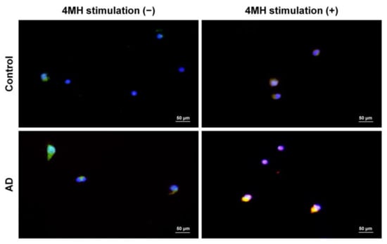The proportion of CLA+H4R+ T cells in CD3+CD45RO+ T lymphocytes was 9.1 ± 5.6% in patients with AD and 4.8 ± 3.8% in healthy controls (Figure 2). To investigate if IL-31 and H4R were simultaneously expressed in sorted CD45RO+CLA+H4R+ T cells, IF studies were performed in samples from healthy controls and from patients with AD. The co-expression of H4R and IL-31 was observed in the AD but not the healthy control group. After 4MH stimulation, simultaneous expression of IL-31 and H4R increased in the AD group, but this change was not observed in the healthy control group (Figure 3).