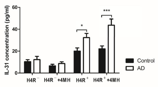 ELISA was performed on culture supernatants of CD45RO+CLA+H4R+ T cells from healthy controls and of patients with AD to compare IL-31 production. As shown in Figure 4, production of IL-31 in CD45RO+CLA+H4R+ T cells of the AD group increased from 32.4 ± 13.3 pg/mL to 47.5 ± 18.7 pg/mL with 4MH stimulation after 24 h. However, production of IL-31 in CD45RO+CLA+H4R+ T cells of the control group was 20.1 ± 10.6 pg/mL without 4MH stimulation and 22.1 ± 9.3 pg/mL with stimulation. CD45RO+CLA+H4R+ T cells of the AD group showed more IL-31 production compared with the control group (p = 0.044), and this gap was wider after 4MH treatment (p < 0.001). The production of IL-31 in CD45RO+CLA+H4R− T cells without 4MH stimulation was 10.4 ± 6.8 pg/mL in healthy controls and 12.3 ± 10.2 pg/mL in patients with AD. The production of IL-31 in CD45RO+CLA+H4R− T cells was not changed significantly by 4MH stimulation in either group (Figure 4).