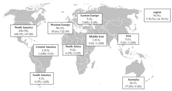 In 339 cases who answered the online survey, geographic data of patients with hereditary hemorrhagic telangiectasia (HHT) were documented (N = 339/474, 72%). Most patients came from North America and western Europe (N = 294/339, 87%). Data of sex was obtained in 99% of all patients (N = 335/339). Data are shown in the number of patients (N) and percentage (for all participants, females (f) and males (m)). A free editable world map was used [16].