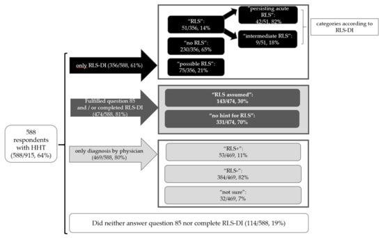Out of 915 respondents 588 could be diagnosed with hereditary hemorrhagic telangiectasia (HHT; the exact explanation can be found in Figure 2 [12]. There were 469 patients with HHT who stated if their physician had already diagnosed restless leg syndrome (RLS) (“RLS+” = RLS was diagnosed, “RLS-” = no RLS diagnosis; question 85 in Supplementary data), and 356 completed the RLS Diagnostic Inventory (RLS-DI). In 474 cases the RLS-DI and/or the question 85 about RLS-diagnosis by their physician were completed. Here, we assumed RLS in 30% of the patients, as they had been diagnosed by their physician and/or showed a pathological result in the RLS-DI (categorized with “RLS” or “possible RLS”). In only 322 patients with HHT, both the completed RLS-DI AND an answer to question 85 (see Supplementary data), were available (please see Table 2 for further information).