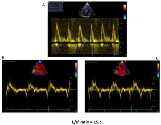 LV diastolic dysfunction occurs early in the AFD disease stages (Figure 2) and represents the substrate for the onset of symptoms and the leading cause of heart failure in these patients [31]. However, LV diastolic dysfunction is not usually severe in AFD. In a report by Palecek et al., 44% of 81 echocardiographic examinations in 35 patients with Fabry disease had a normal LV filling pattern, while 63% showed impaired LV diastolic function. Of these, only 4% had a restrictive filling pattern, while 60% had a pseudo-normal filling pattern, and 36% impaired relaxation [32].
