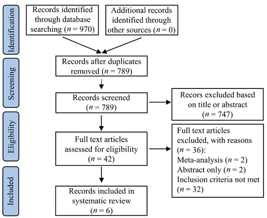 Our search in prespecified databases retrieved 970 citations. After excluding 181 duplicates, 789 publications were left for screening. In addition, 749 citations were excluded after title or abstract screening, leaving 40 articles for full-text assessment. An additional 36 references were excluded after full-text reading, due to: Meta-analysis (2), abstract only (2), and inclusion criteria not being met (32), leaving six studies included in the systematic review (Figure 1).