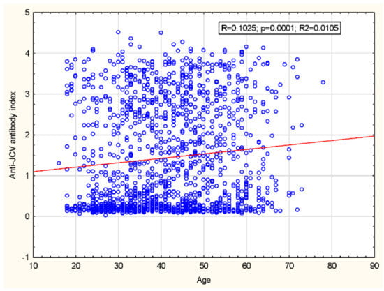 The results presented above were used to conduct a covariance analysis and an analysis of the impact of the patient’s age on the remaining correlations studied. The ANCOVA model included the course of MS, EDSS score and disease duration as quality-independent variables and age as a continuity-independent variable. The results showed that only an older age at the time of serum sampling is significantly correlated with an increase in the prevalence of anti-JCV Ab in the study cohort. At the same time, the quality characteristics (MS course, EDSS score and disease duration) do not significantly impact anti-JCV Ab serostatus and AI (p > 0.05).