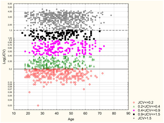 The countries of East Asia (Japan, China, South Korea) markedly differ from other regions because they show JCV seropositivity rates ranging from 69.5% to 80% [14,15,16]. The reason for such a large discrepancy in the seroprevalence of anti-JCV Ab between countries in East Asia and the rest of the world (including our data) remains unclear. The recently presented hypotheses aim to explain the phenomenon mentioned above by the differences in the prevalence of specific JCV genotypes depending on the geographic region. It was demonstrated that of the four main JCV genotypes, type 1 dominates in Europe and type 2 in Asia. Therefore, complex relationships resulting from the impact of genetic and immunological factors on the interaction between the specific virus type and the host may explain the observed differences in the seroprevalence rate [15].