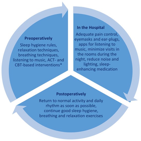 How to improve sleep quality pre- and postoperatively. Non-pharmacological interventions to support sleep preoperatively should be continued postoperatively. Abbreviations: CBT = Cognitive Behavioral Therapy; ACT = Acceptance and Commitment Therapy. * Need to be initiated about 6–8 weeks before surgery.