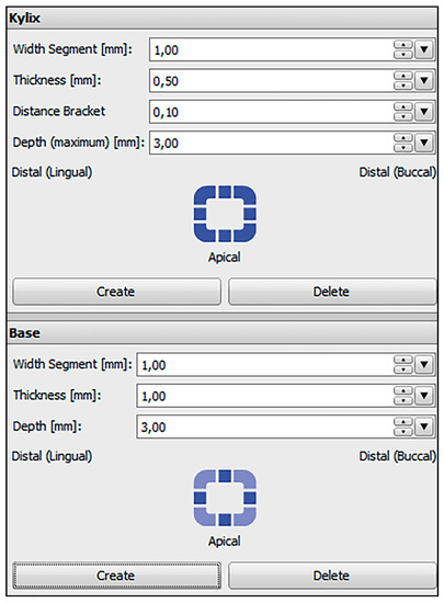 Plaster models of 27 patients with permanent dentition and in need of orthodontic treatment were digitized with an optical scanner (TRIOS®3W, 3Shape, Copenhagen, Denmark). The scans were saved as standard tessellation language (STL) files and imported to the treatment simulation software OnyxCeph3™ (Image Instruments, Chemnitz, Germany). All bracket positions were determined and virtually placed using the OnyxCeph3™ FA-Bonding module. The patient models were planned with metal brackets (0.018-inch slots) for incisors, canines and premolars (discovery® smart, Dentaurum, Ispringen, Germany) and metal tubes for the first and second molars (Ortho-Cast M-Series, Dentaurum, Ispringen, Germany) in the upper and lower jaw. Eight patient models got ceramic brackets (discovery® pearl, Dentaurum, Ispringen, Germany) from the second premolar on one side to the second premolar on the contralateral side in the upper jaw. The pre-bonding bracket positions were set for every tooth including the first and second molars. Based on the determined bracket positions, frames were virtually created around every bracket in the OnyxCeph3™ Kylix 3D module (Image Instruments, Chemnitz, Germany). All transfer models including the bracket frames were exported as STL files. The parameters used for the dimension of the frames are shown in Figure 2.