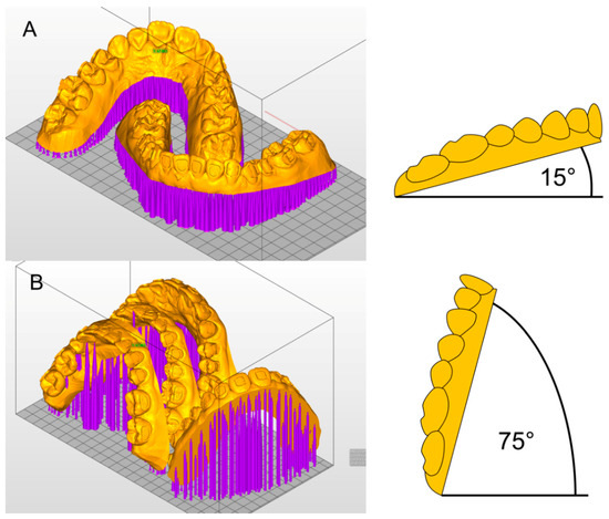 Printing orientation in (A) Group H and (B) Group V in Asiga MAX™ printer software (Asiga Composer, Scheu Dental, Iserlohn) and model angulations.