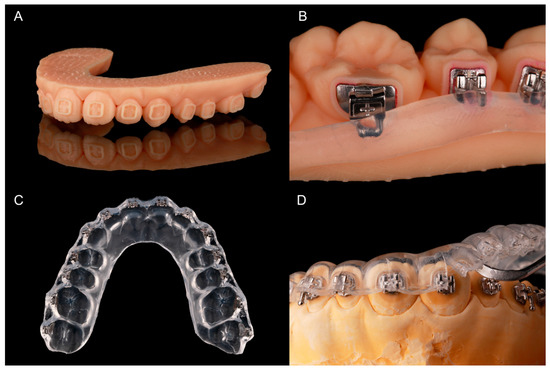 All brackets were temporarily bonded into their frames with a water-soluble adhesive (Ortho Laboratory Adhesive for Indirect Bonding, 3M™ Unitek, St. Paul, MN, USA). The brackets were then blocked out up to the middle of the slots with a silicone (SIL-KITT®, Scheu Dental, Iserlohn, Germany). The hooks of the molar tubes were also covered (Figure 4B). The models were placed into a pressure molding machine (BIOSTAR®, Scheu Dental, Iserlohn, Germany) to produce an ethylene-vinyl acetate tray (BIOPLAST® 2.0 × 125 mm, Scheu, Iserlohn, Germany). The tray—containing the brackets—was cut into shape (Figure 4C) and put into water for 30 min to dissolve the adhesive. To allow an easy removal of the tray after IDB, it was cut with a scalpel from the margin to the middle of the brackets or tubes.
