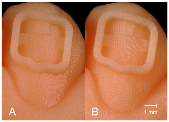The positioning of dental models on the build platform of a printer is often mentioned to influence the precision. The staircase effect that occurs on the surface of a printed object has a great impact on accuracy and appears differently depending on the printing direction [19]. Figure 6 shows the staircase effect on the transfer models with bracket frames in Groups H (A) and V (B). Previous studies found different ideal printing directions. Hada et al. compared SLA printed dentures in three different angulations (0°/45°/90°) on the build platform. Unkovskiy et al. used the same printer type and angulations to produce specimens. An angulation of 45° achieved the best results in both studies [19,23]. Shim et al. printed specimens of different angulations and identified 90° to be the best orientation for precise manufacturing [20].