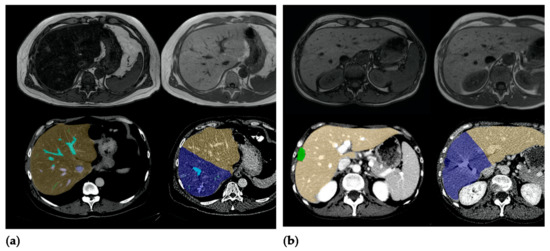 (a) Patient A, a 59-year-old male patient with steatosis (hFF 40.2%), hypertrophy rate 40.9%. (b) Patient B, a 47-year-old female patient without elevated hepatic fat fraction (hFF 4.9%), hypertrophy rate 9.3%.