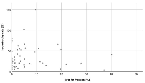 The mean degree of hypertrophy of the FLR in patients with a normal hFF was 24 ± 31% (range: −100 to 101%). The mean degree of hypertrophy of the FLR in patients with an elevated liver fat fraction was 28 ± 36% (range: −16 to 149 %). The mean growth rate per week was 9 ± 9% (range: −8 to 35%) in patients with a normal hFF, and 8 ± 10% (range: −4 to 38%) in patients with an elevated hFF.