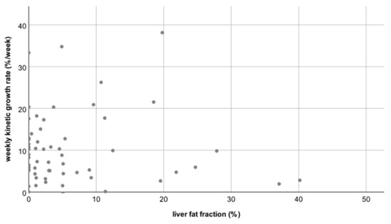 Multivariable analysis including gender, initial tumor mass, fat fraction, and laterality of primary colorectal cancer revealed no correlation between these factors and the degree of hypertrophy or the hepatic growth rate (Table 4 and Table 5), only a marginal inverse correlation between the patient’s age and the KGR/week (R = −0.24; p = 0.04; see Figure 5). No correlation was found for gender, initial tumor mass, fat fraction, and laterality of primary.