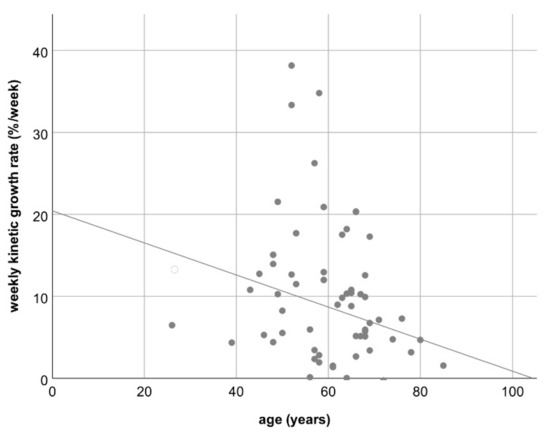 Scatterplot C: Loose inverse correlation between the patient’s age and the weekly kinetic growth rate; R = −0.24 (p = 0.04).