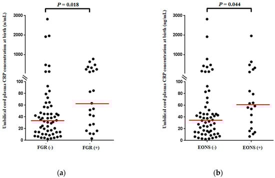 3.2. Umbilical Cord Plasma (UCP) CRP Concentrations at Birth According to the Presence or Absence of Fetal Growth Restriction (FGR) and Early Onset Neonatal Sepsis (EONS)