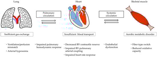 The energy for exercise is produced mainly by aerobic metabolism, and it relies on both central factors (lung, heart, and pulmonary circulation) and peripheral factors (skeletal muscle and systemic circulation) []. Exercise intolerance in patients with PAH is caused by the complicated mechanisms of central and peripheral dysfunctions (Figure 1). Abnormal proliferation of vascular cells in the small pulmonary arterioles along with imbalance of pulmonary vasodilators and vasoconstrictors results in a reduction in the reserve capacity of pulmonary circulation [], which could cause an abnormal hemodynamic response to exercise. Abnormal pulmonary hemodynamic responses can result in inefficient gas exchange. Hypoperfusion of ventilated alveoli increases the ventilation/perfusion mismatch, resulting in exertional dyspnea []. A reduced pulmonary capillary bed can cause arterial hypoxemia, leading to exertional dyspnea []. RV contractility increases at rest, whereas RV contractile reserve decreases []. The RV-pulmonary arterial (PA) coupling indicates the efficiency of energy transfer from the RV to the PA based on the notion that the right heart and the pulmonary vasculature are not separate systems, but continuous cardiovascular units []; this efficiency is calculated as the ratio between RV end-systolic elastance (RV contractility) and PA elastance (RV afterload) []. RV–PA coupling was impaired during exercise in patients with PAH because of an increased RV afterload without a sufficient increase in RV contractility to compensate for it []. LV diastolic dysfunction due to ventricular septal displacement also occurs due to the increased RV afterload []. Insufficient blood transport to cater to the oxygen demand leads to exertional fatigue and dyspnea. The baseline stroke volume and heart rate response were independent determinants of exercise capacity in patients with PAH [,]. Patients display a low proportion of type I muscle fibers and reduced muscle oxidative capacity [], resulting in aerobic metabolic disorders. The aerobic capacity of the skeletal muscle is reduced, and the early occurrence of anaerobic metabolism leads to exertional fatigue. In addition, early lactic acidosis stimulates breathing, resulting in dyspnea []. The maximum oxygen uptake was correlated with the strength of the quadriceps, and oxygen uptake at the anaerobic threshold was correlated with muscle oxidative capacity []. Peripheral endothelial dysfunction may result in impairment of systemic circulation [], leading to exertional fatigue.