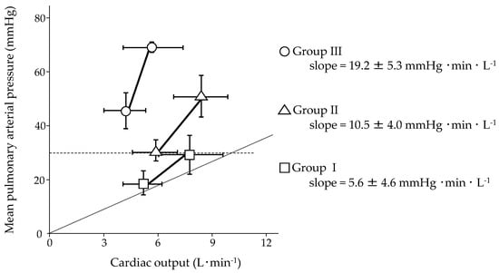 Mean pulmonary arterial pressure (mPAP)/cardiac output (CO) slope during submaximal exercise testing in 32 patients with pulmonary arterial hypertension (PAH) stratified into three groups based on mPAP at rest. All the patients were clinically stable with PAH-specific combination therapy. The figure was generated from our original data recently published []. Group I (square) indicates patients with resting mPAP < 25 mmHg, Group II (triangle) indicates patients with 25 mmHg ≤ resting mPAP < 40 mmHg, and Group III (circle) indicates patients with resting mPAP ≥ 40 mmHg. Straight line indicates mPAP/CO slope of each group during exercise testing. The broken line represents resting mPAP of 30 mmHg, and the dotted line represents the mPAP/CO slope of 3 mmHg·min·L−1.