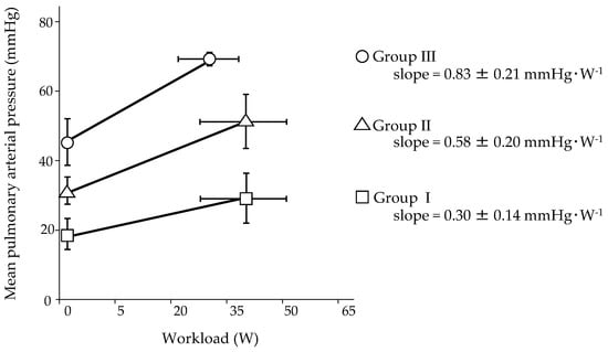 An impaired pulmonary hemodynamic response to exercise could be one of the keys to clinical deterioration. We clarified the relationship between baseline hemodynamics and the mPAP/CO slope during exercise in patients with PAH by reassessing our original and recently published data on 32 patients, whose hemodynamics at rest were moderately to severely impaired before treatment []. After PAH-specific combination therapy, patients were clinically stable and were classified a functional class I or II according to the World Health Organization (WHO). Incremental submaximal exercise testing with right heart catheterization was performed using a cycle ergometer. The patients were classified based on resting mPAP (Group I: resting mPAP < 25 mmHg, Group II: 25 mmHg ≤ resting mPAP < 40 mmHg, and Group III: resting mPAP ≥ 40 mmHg), and their two-point mPAP/CO slopes were assessed (Figure 2). During the exercise test of the three groups, it was found that the mPAP increased modestly with an increase in CO, which was reduced compared to healthy subjects (low pressure, low flow) in Group I [,]. The mPAP increased significantly in Group II; however, the increase in CO was reduced (high pressure, low flow) in this group. In Group III, the mPAP increased significantly, and CO increased slightly (very high pressure, very low flow). The mPAP/CO slope of Group I was nearly parallel, with a slope of 3 mmHg·min·L−1. The slope of Group II was steeper than that of Group I, and the slope of Group III was steeper than that of Group II. Thus, the pulmonary hemodynamic response in Group I was near normal, and the impairment of the pulmonary hemodynamic response in Group III was more severe than that in Group II. This result suggests that the RV afterload was much higher in Group III, resulting in a greater increase in RV wall stress than in the other two groups. The mPAP/workload slopes for the three groups are shown in Figure 3. Hasler et al. investigated the pulmonary hemodynamic response in patients with PAH (n = 54) or distal chronic thromboembolic PH (n = 16), 35% of whom were undergoing PAH-specific combination therapy []. Although resting mPAP was 34 mmHg, mPAP/CO slopes were steep (multipoint mPAP/CO slope was 14.2 mmHg·min·L−1 and two-point mPAP/CO slope was 17.0 mmHg·min·L−1) (Table 1), and the mPAP/CO slopes were predictive of 3-year transplant-free survival. This result might substantiate the aforementioned detrimental effect of exercise in progressive PH rats with RV maladaptation to increased afterload [].