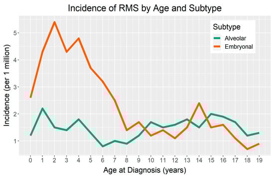 Between 1975 and 2005, there was no significant change in the incidence of RMS overall or ERMS in the United States [11]. This is in contrast with the steady increases in the incidences observed for other pediatric cancers [3,17,18]. While there has been an increase in the incidence of ARMS (annual percent change (APC) = 4.20, 95% confidence interval (CI) = 2.60–5.82), this is likely due to changes in diagnostic criteria. While there is no conclusive evidence that the incidence of RMS has changed over time, there are data suggesting that the incidence of RMS varies significantly by demographic factors, including age, biological sex, and geographic location.