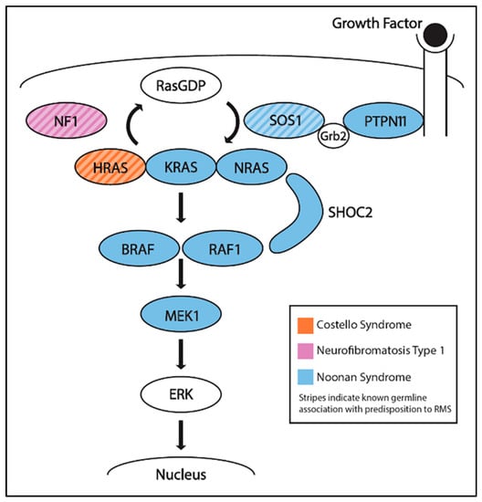 NS is another autosomal dominant syndrome that is caused by defects in several genes in the Ras pathway, including KRAS, NRAS, RAF1, BRAF, PTPN11, SOS1, SHOC2, or MEK1, which result in Ras pathway activation (Figure 3). Individuals with NS can display developmental delay, intellectual disabilities, distinctive facial features, and congenital heart defects [65]. Despite the multiple genes that are associated with NS, the only gene with reported germline mutations in two patients with NS and ERMS is SOS1 [66,67]. In a study of 45 individuals with NS and a history of cancer, the top three malignancies were ALL (n = 8), neuroblastoma (n = 8), and RMS (n = 6, 1 botryoid and 5 ERMS) [58].