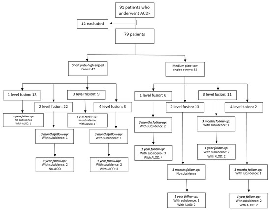This study was approved by the Institutional Review Board of the authors’ hospital (4-2020-1161). From January 2016 to June 2019, a total of 91 patients who underwent ACDF were prospectively enrolled. The patients who had less than 1-year postoperative follow-up, including those with inadequate radiologic images, were excluded from the study. Final patient count included in the study was 79, with 248 segments. Cervical spondylotic myeloradiculopathy (CSMR) is the most common cause of compression with 50 patients (63.3%); 3 patients (3.8%) had ossified posterior longitudinal ligament (OPLL); 26 patients (32.9%) had cervical disc herniation (HCD). There were 47 patients (59.5%) who had short plates–high angle screw (22.8 ± 5.3 to 23.3 ± 4.7 degrees) insertion, and 32 (40.5%) patients with medium plates–low angle screw (12.3 ± 2.5 to 13.2 ± 3.2 degrees) insertion. A total of 19 patients (24.05%) had one-level fusion, 35 (44.3%) had two-level fusion, 20 (25.32%) patients underwent three-level fusion, and 5 (6.33%) patients underwent four-level fusion surgery (Figure 1, flow diagram).