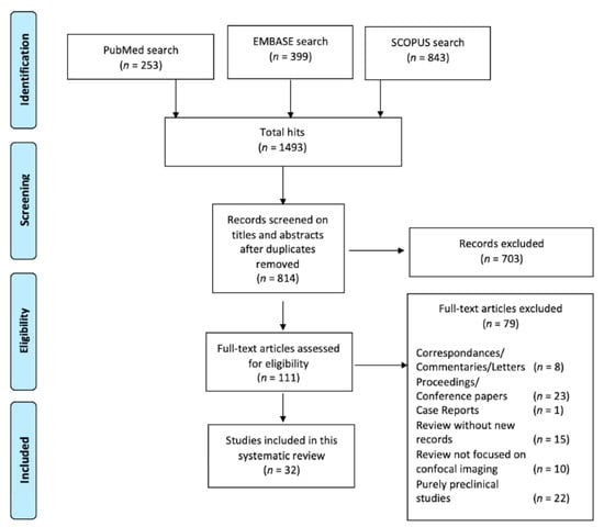 A comprehensive, systematic literature search was performed in January 2021. MEDLINE (PubMed), EMBASE and SCOPUS were searched using the following search strings in the “Title/abstract” field: “confocal AND neurosurgery”, “confocal AND glioma”, “confocal AND brain tumor”, “endomicroscopy AND neurosurgery”, ”endomicroscopy AND brain tumor”, “endomicroscopy AND glioma”, “confocal imaging AND glioma”, “confocal imaging AND brain tumor”, “confocal imaging AND neurosurgery”, “confocal endomicroscopy AND glioma”, “confocal endomicroscopy AND brain tumor”, “confocal endomicroscopy AND neurosurgery”, “Cellvizio AND glioma”, “Cellvizio AND brain tumor”, “Cellvizio AND neurosurgery”, “Endomag1 AND glioma”, “Endomag1 AND brain tumor”, “Endomag1 AND neurosurgery”, “Convivo AND glioma”, “Convivo AND brain tumor” and “Convivo AND neurosurgery”.