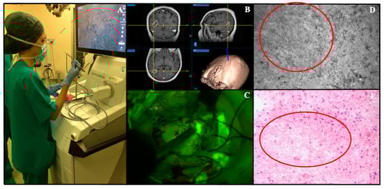 - Pavlov, V.; Meyronet, D.; Meyer-Bisch, V.; Armoiry, X.; Pikul, B.; Dumot, C.; Beuriat, P.A.P.-A.; Signorelli, F.; Guyotat, J. Intraoperative Probe-Based Confocal Laser Endomicroscopy in Surgery and Stereotactic Biopsy of Low-Grade and High-Grade Gliomas: A Feasibility Study in Humans. Neurosurgery 2016, 79, 604–611. [Google Scholar] [CrossRef] [PubMed]
