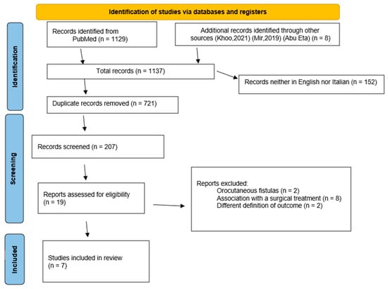 After the application of selection criteria, a total of seven articles were included in the present review and the PRISMA flowchart is represented in Figure 1. Non-surgical strategies for PCF closure included botulinum toxin therapy (2 studies), HBOT (2 studies), and NPWT/VAC (3 studies) for a total of 27 patients. In all cases, these treatments were specifically added to the standard PCF care that included compressive dressings, systemic broad-spectrum antibiotics administration, and enteral artificial nutrition, usually by a nasogastric feeding tube.