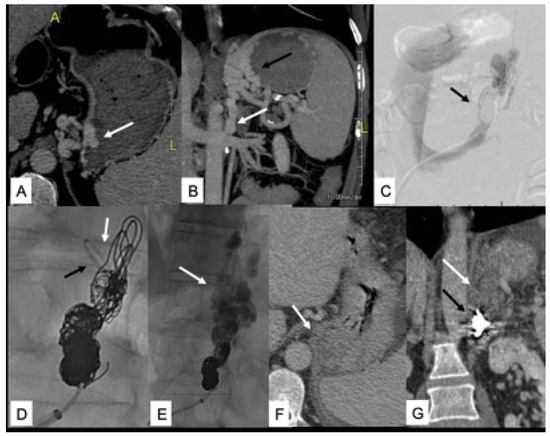 (A,B) Pre-procedural CT axial and coronal reformats show intra- and extramural gastric varices (GV) (white arrow in (A) and black arrow in (B)) and GRS (white arrow in (B,C)). Coil embolization of GRS (black arrow) with persistent shunt patency. (D) Angiographic catheter distal to coils (black arrow) and coaxial microcatheter looped backward for NBCA injection (white arrow). (E) Extensive filling of GV with gelfoam and contrast media (white arrow). (F,G) Post-procedural CT shows complete thrombosis of GV and GRS (white arrow) and coils in the GRS (black arrow).
