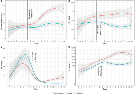 The statistical analysis was performed using the R-programming language 3.6.3 (R Foundation, Vienna, Austria). The results were presented as median (interquartile range) or a number (percentage). The comparisons between the investigated groups were made using the Mann–Whitney U-test and chi-squared test, and p-value < 0.05 was considered to be significant. Due to the limited number of patients, we did not use the regression analysis. We used the LOESS curve fitting to compare changes in inflammatory markers. The receiver operating characteristic (ROC) curve was analyzed to assess inflammatory marker cut-offs, predicting death after tocilizumab administration. The diagnostic scores were mean concentrations of inflammatory markers (WBC, LDH, CRP, and IL-6) in serum within 7 days before as well as 7 and 14 days after administration of tocilizumab. The classes of observations were: death (coded as 1) and survival (coded as 0). The optimal cut-off point was established using Youden’s index. If the 95% confidence interval of the area under the ROC (AUROC) surpassed 0.50 the association was considered non-significant. The analysis was performed using the ROCit package of R (https://cran.microsoft.com/web/packages/ROCit/ROCit.pdf (accessed on 8 December 2020) [18]).