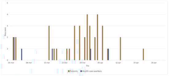 The total number of recruited patients in the study periods was 699, of which 426 males and 273 females, with a median age of 68 years (range 17 to 98 years) (Table 1). From March to April 2020, 39 out of 381 patients (10.2%) resulted positive to SARS-CoV-2 testing with a molecular nasopharyngeal swab after a median length of stay of 7 days (range 1–200) (Figure 1). From September to December 2020, only 1 out of 318 patients (0.003%) resulted positive to SARS-CoV-2 after 6 days spent in the gastroenterological ward. Notably, most of them (35/40) had at least one molecular nasopharyngeal swab negative for SARS-CoV-2 performed before ward admission (i.e., emergency room or pre-hospital triage), while 4 cases occurred in patients admitted a few days before the adoption of a systematic SARS-CoV-2 pre-hospital triage when the first COVID19 outbreak was already in progress but still largely unexpected. Among the 40 patients who tested positive for SARS-CoV-2, 27 (67.5%) had respiratory symptoms (at least one among cough, dyspnea, and mild respiratory insufficiency) at the time of hospital admission, 7 (17.5%) developed respiratory symptoms during the hospital stay, and 6 (15.0%) had no respiratory symptom. No false positive or false negative tests were found during the first and the second wave.