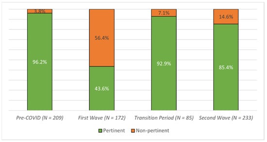 Descriptive data were expressed as counts and percentages for categorical variables, as medians and ranges for continuous variables. The chi-squared test was used to analyze dichotomous variables. Univariate log-binomial regression models were used to calculate prevalence ratios (PR) and 95% confidence intervals (CI) for different periods vs. the pre-COVID period. The Kruskal–Wallis test was applied for the analysis of quantitative variables in the 4 periods. Statistical analyses were performed using Stata 17 (StataCorp., College Station, TX, USA, 2021).