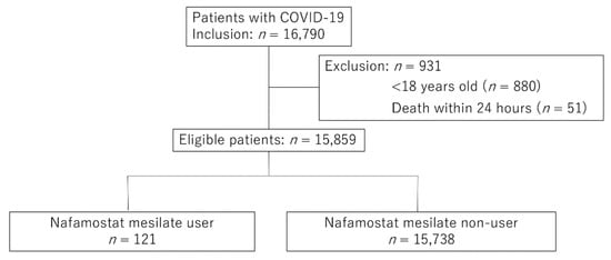 Recent previous basic experimental [] and case reports or series [,,,] have suggested the potential effectiveness of NM against COVID-19. However, to our knowledge, neither clinical trials nor observational studies, except for a recent small phase 2 open-label, randomized controlled trial (RCT) [] have demonstrated an association between NM and reduced mortality. Therefore, we aimed to evaluate the effect of NM in patients with COVID-19 using a large-scale in-patient database in Japan.