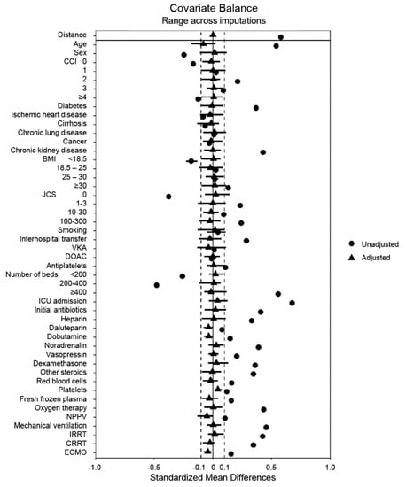A summary plot of covariate balance before and after matching. BMI, body mass index; CCI, Charlson comorbidity index; CRRT, continuous renal replacement therapy; DOAC, direct oral anticoagulant; ECMO, extracorporeal membrane oxygenation; ICU, intensive care unit; IRRT, intermittent renal replacement therapy; JCS, Japan Coma Scale; NPPV, noninvasive positive-pressure ventilation; VKA, vitamin K antagonist.