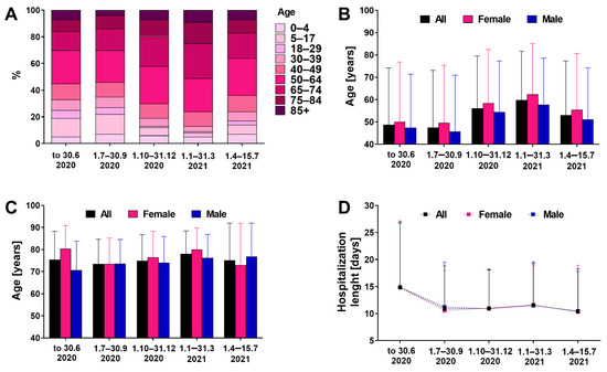 Structure of age (A) and mean ± SD age (B) of patients hospitalized in different periods of pandemic (n = 5199). (C) Age of patients who died in different periods of the pandemic. (D) Time of hospitalization (mean ± SD) in different periods of the pandemic.